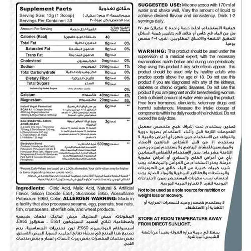 - 3 g o EAAs (750 mg of L-Lysine – 750 mg of L-Threonine – 750 mg of L-Methionine – 500 mg of -Phenylalanine – 125 mg of L-Tryptophane – 125 mg of L-Histidine)
