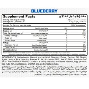 It consists of Maltodextrin, natural & artificial Blueberry flavor, Dextrin, and spirulina powder.