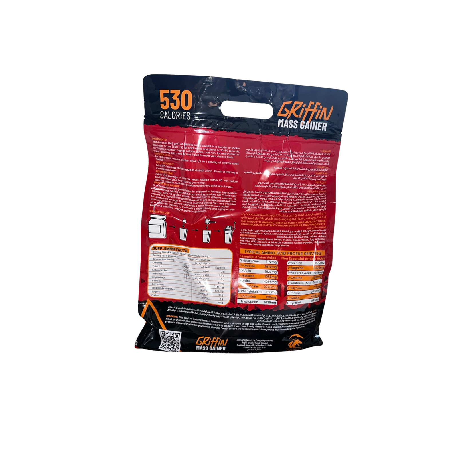 جريفين ماس جينر يحتوي على نسبة عالية من السعرات الحرارية المعززة ببروتين بناء العضلات والكربوهيدرات والكرياتين أحادي الهيدرات والمواد المغذية الأساسية. يعمل جريفين  ماس جينر على تسهيل الحصول على الكثير من السعرات الحرارية إلى جانب البروتين عالي الجودة لبناء العضلات، حتى تتمكن من زيادة الوزن بسرعة