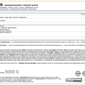 Each serving (75 g) provides 23 g of premium protein, 45 g of carbohydrates, and a 4875 mg creatine matrix, making it an excellent choice for hard gainers and athletes with high energy demands.