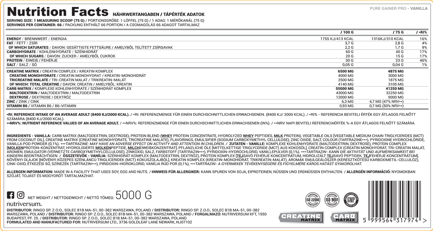 Gainer Pro is an effective solution since one serving of the product (75 g) has not only 23 g premium protein* which can be the bricks for your building muscles, but also 45 g carbohydrates which will provide energy for the construction – thus 2 essential macronutrients can be given to your body right after working out. To make the product even better, we complemented it with 4875 mg Creatine Monohydrate** /serving, so you can achieve your goals even faster!
