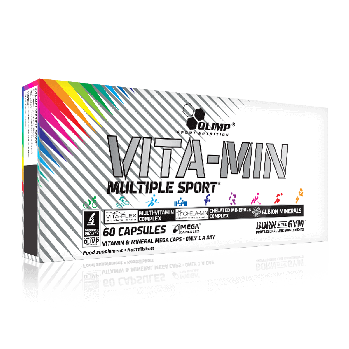 Vita-Min Multiple Sport® Mega Caps®/Mega Capsules® NEW FORMULA is a complex combination of vitamins (Vita-Plex Sport®) containing among others the innovative new-generation PureWay-C® vitamin C together with a complex of special extracts (HEPA-PROST DETOX) that support proper liver and prostate functioning. The second capsule (Chela-Min Sport®), in the set contains highly assimilable, top-quality minerals in the form of amino acid chelates from ALBION®. Both complexes Vita-Plex Sport® and Chela-min Sport® facilitate the fulfilling of the basic demand for the necessary nutritional microsubstances for a body burdened by intense physical output.